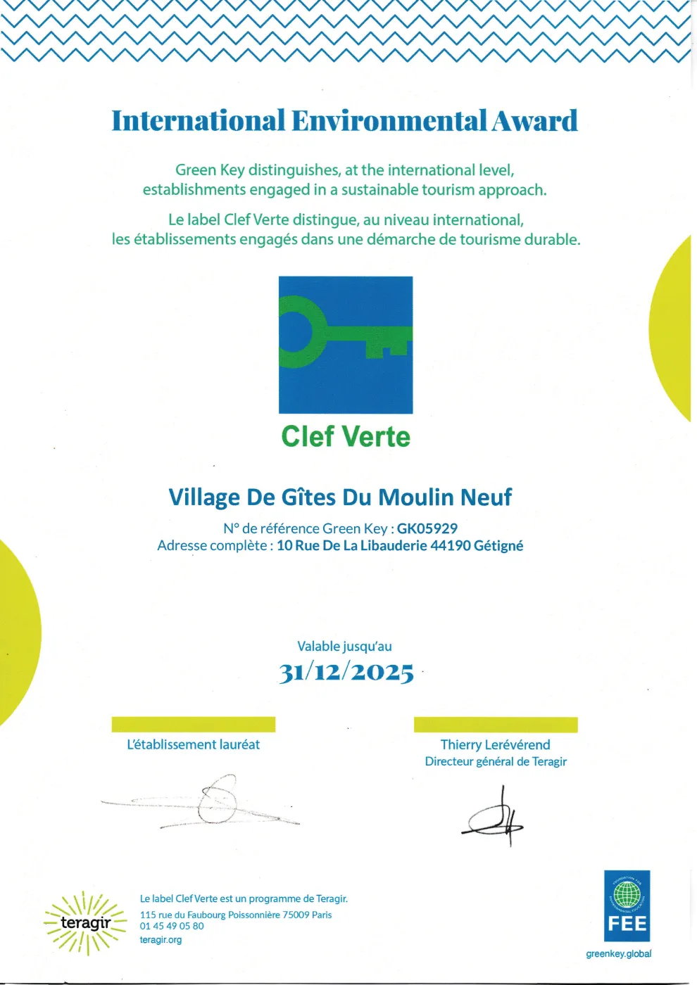 Le label Clef Verte distingue les hébergements touristiques et les restaurants engagés dans une démarche environnementale volontaire, performante et dynamique. Le label est attribué annuellement par un jury indépendant constitué d’experts et de professionnels du tourisme et de l’environnement.